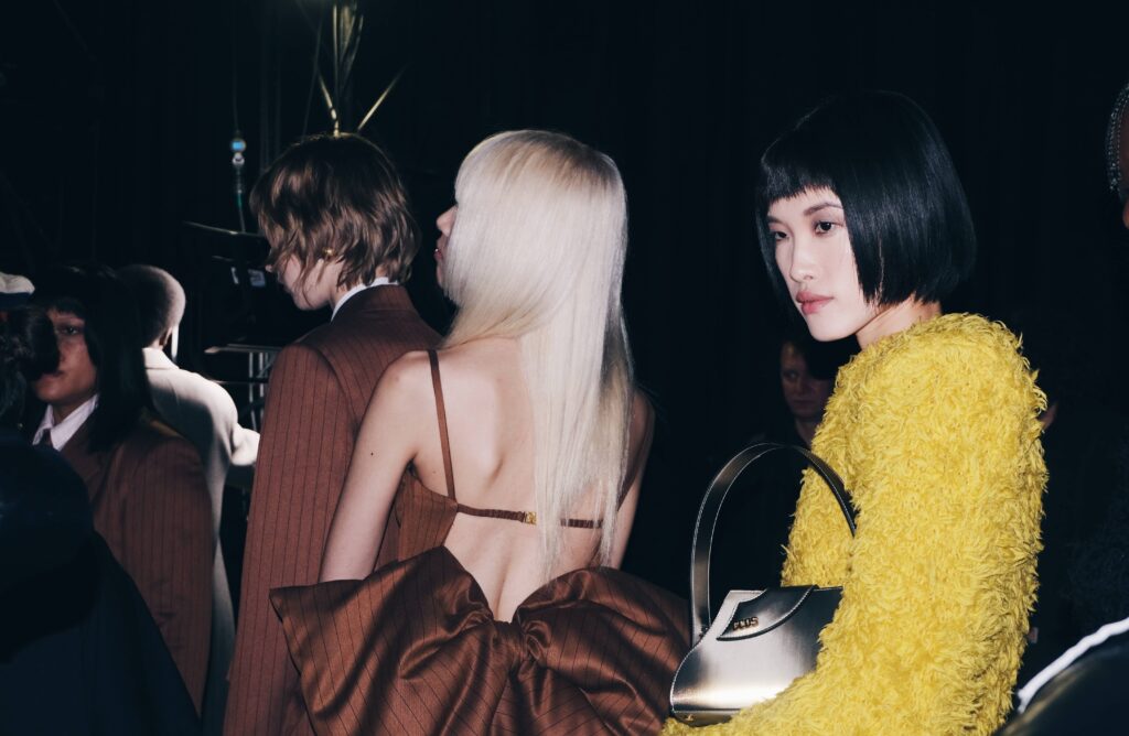 I corridoi stretti e affollati sono invasi da modelli e vestiaristi, stilisti che mettono a punto gli ultimi dettagli dei loro capolavori e truccatori e parrucchieri che trasformano i volti e i capelli dei modelli in opere d’arte viventi. C’è una sensazione di eccitazione nell’aria, una sorta di magia che permea ogni angolo dei backstage mentre il tempo scorre veloce e le ore che precedono lo spettacolo sembrano evaporare in un istante.